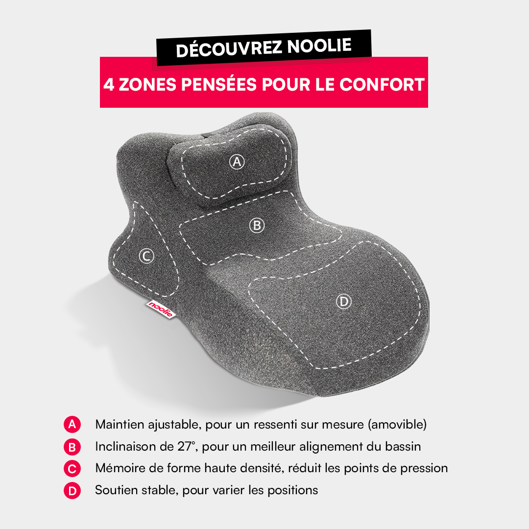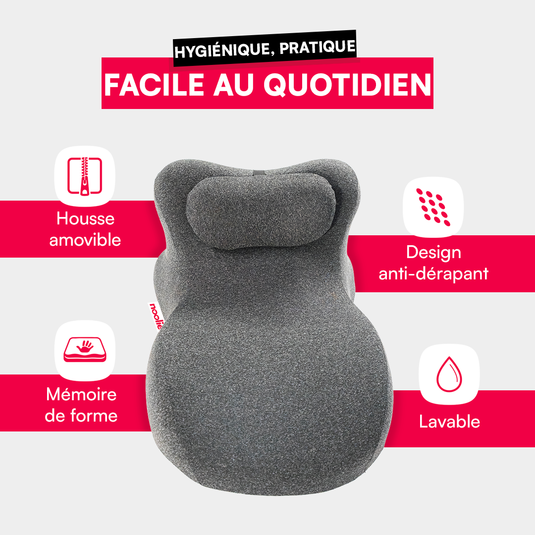 Le Coussin Noolie™ est fabriqué en mousse à mémoire de forme de haute qualité avec une housse hypoallergénique. Son angle ergonomique de 27°, scientifiquement prouvé, épouse naturellement l’anatomie féminine et soulage le mal de dos.