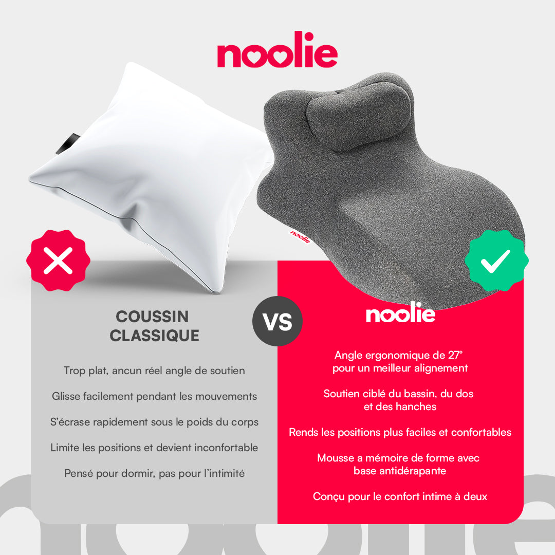 Parce que partagez des moments intimes ne devrait jamais être freiné par des douleurs et des positions inconfortables, nous avons créer Noolie, un coussin spécialement conçu pour vous redonnez le plaisir du sport… de chambre. 😋